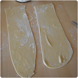 If you don't have a pasta machine: take a piece of dough and make it flat and thin with a rolling pin. Cut them according with the length you want (25cm / 11inch). Put extra flour on the pasta sheets and roll them. |