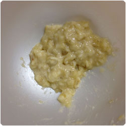 Put banana in a mixing bowl and mash it with a fork. |