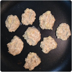 Add the banana in the oatmeal bowl and mix. Warm up a non-stick pan (no oil needed) and add the mixture with a spoon forming small flat balls. |