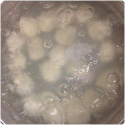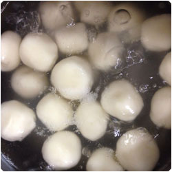 Prepare a bowl with cold water and add the mochi balls. Strain when cold. If you need them for later, don't leave them get too dry, they will get very sticky. In case put them i water again. |