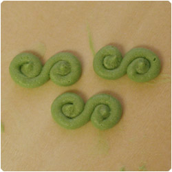 S ribbon. Start to make a dot and to rorate the tip around the dot. Once you almost complete the rotation keep sqeezing and add a new rotation in the opposite sense close to the first one. Sqeeze constantly the icing until you complete the second rotation. Stop preassure the bag in the center and lift tip away. |