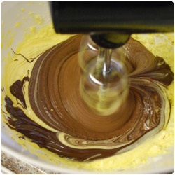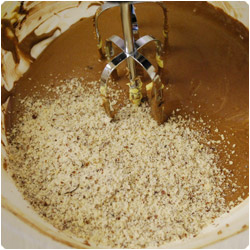 Mix in the cooled chocolate until blended. Combine it with the dry hazelnut mixture. |