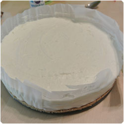 Butter a cake pan and add a sheet of parchment paper cut same size of the bottom. Melt the butter in the microwave and let it cool a bit. Add the butter into a bowl with the crushed biscuits. |