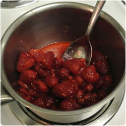 Before to serve make the raspberry reduction. Warm up half of the raspberries in a small pot with the lemon juice until soft. Use a colander to take out the seeds. To see how to make a reduction see the recipe here. Take out the cake from the refrigerator. |