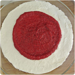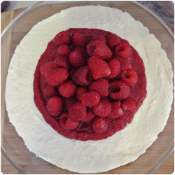Remove the borders and place it on a serving plate. Spread the raspberry reduction in the center of the cake and place nicesly the rest of the raspberries on top. |