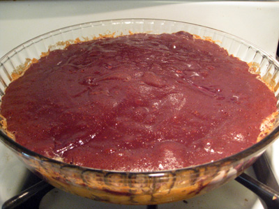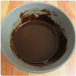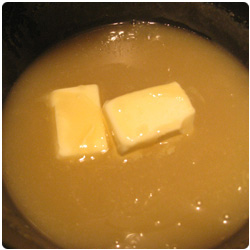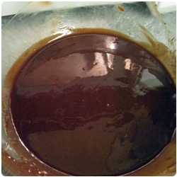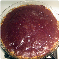 Remove from heat let cool a bit and add the butter. Prepare the top filling: melt the chocolate and butter in microwave (30 sec at a time – careful not to burn the chocolate). |