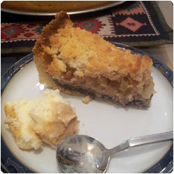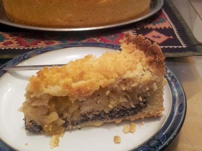 IngredientsUpper layer:- 1 cup flour (140g) - 1/2 cup sugar (100g) - 100 g butter Poppy stuffing- 200 g of finely ground poppy seeds - 1 packet vanilla sugar - 1/2 cup milk - Grated lemon peel - 100 g chopped nuts - Sugar to taste Apple stuffing- 1 kg green apple - Sugar to taste - Cinnamon and raisins if you like - 50g butter Bottom dough layer- 300 g flour - 200 g soft butter - 1/2 cup sugar (100g) - 2 egg yolks - 1 Bag of vanilla sugar (9g) - Bit Cognac / Brandy |