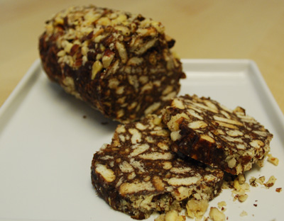 Ingredients- 300g of tea biscuits - 120g of butter - 1 spoon of Rhum or Marsala wine - 3 tablespoon of dark cocoa powder - 50g of sugar - 50g of nuts - 1 egg (eventually 1 more)