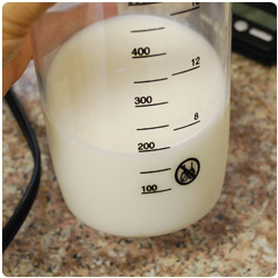 Add the one teaspoon of baking powder to 150g flour. Misure 200ml of milk. Add the flour spoon by spoon into the mixture. |
