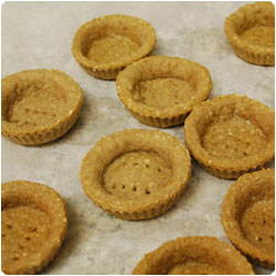 Place the round dough in the baking cups and press it on the bottom. The border of the pie sould be no more than 1,5cm. With a fork make some holes in the bottom of the pie. |