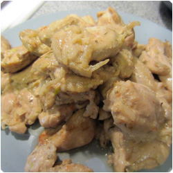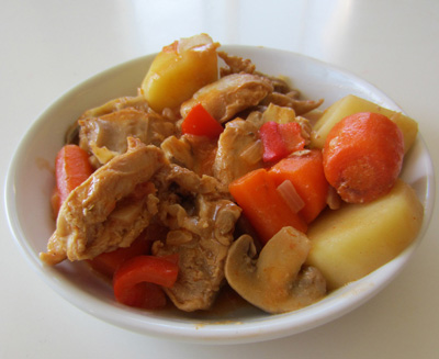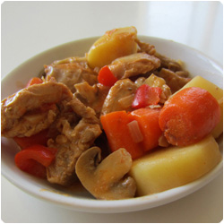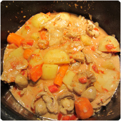 Ingredients- 1 kg boneless chicken thigh Marinade:- Juice of one small lemon - 1 teaspoon salt -- half teaspoon pepper - 1 small onion chopped -- 3 stalks scallion chopped - 1 red bell pepper chopped -- 1 tomato chopped - 3 cloves of garlic chopped thin - 1/2 inch of ginger mashed in a garlic press - 3 sprigs of fresh thyme -- 2 spoons of soy souse - 1 hot pepper or some chili powder (optional) Oil for frying- Vegetables of your choice cut (potatoes, carrots, mushrooms, celery or others) - 0.25 cup of coconut milk, stirred in to 1 spoon of flour - half cup of red wine |