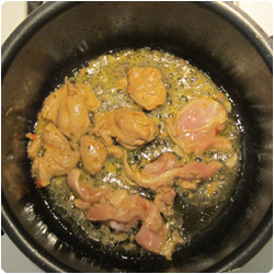 Shake off all the marinade vegetables and fry the chicken just until white from the outside. When all the chicken is done, remove from the pot. Use the same oil to fry the vegetables for about 5 minutes. |