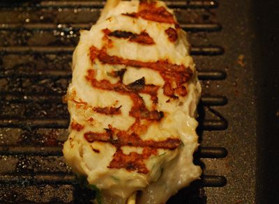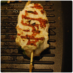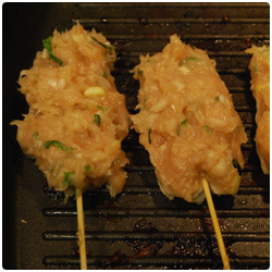Wash your hand. Take some meat with one hand and with the other put the wood stick in the middle. Grill them in a non-stick pan, oil is not necessary but you can add one tablespoon of vegetable oil if they stick too much to the pot. Turn them few times until the chicken is cooked and they are tanned on both sides. |