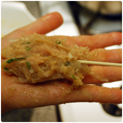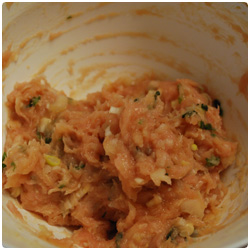 Ingredients- ground meat 1lb (this time we used turkey) - green onion 10cm - 2 shiso leafs - 1 egg - ginger 1 cube(2cm×2cm) - 1tbs soy sauce - salt and pepper - (usually I add 1 tbs of sesami oil)
