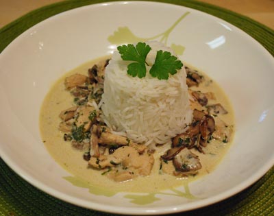 Ingredients- 1 chicken breast - 1/2 onion - 300g of mushrooms - italian parsley, chopped - olive oil - 1-2 cups of whipping cream - 1 cup of chicken broth - 1 cup of basmati rice - salt and pepper |