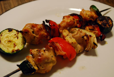 Ingredients- 1 chicken breast (or boneless skinless chicken thighs) - 2 zucchini - 1 red bell pepper - half onion - 1-2 slices of bacon To marinate- 1 tblspoon of mustard - oregano, rosmary, bay leaves, salt and pepper