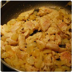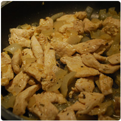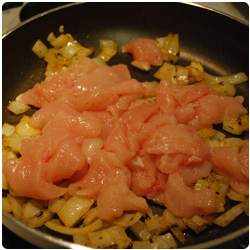 Cut in thin, small slices the chicken breast. Add them in the pan and stir. |