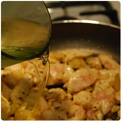 Stir at high heat for few min until the chicken is cooked and then add the wine. Let it evaporate and set the fire at low heat. |