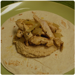 Cook for other 5 to 10 min until the chicken is cooked. In a plate, put a soft taco (better if you have pita bread) and spread some hummus over it. |