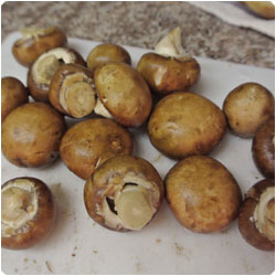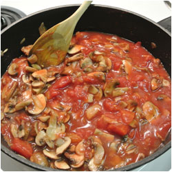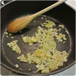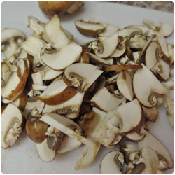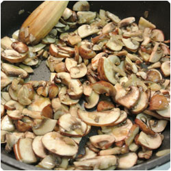 Dice an onion and let it sweat in a pan with some olive oil. Chop the mushrooms and add them in the pan and stir until they get soft. |
