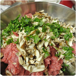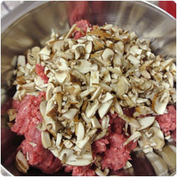 In a mixing bowl add: the ground meat, finely chopped mushrooms, |