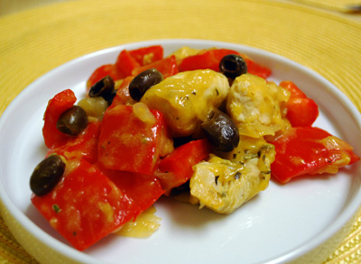 Ingredients- 450g of chicken breast (1lb) - 4 red bell peppers - 1tablespoon of french mustard - 1 white onion - black olives - oregano/basil/rosemary - 1 cup of potato starch - 1 glass of white wine |