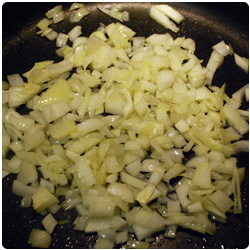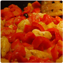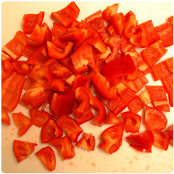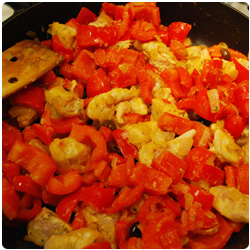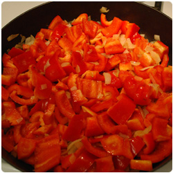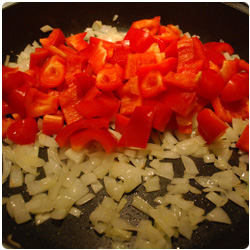 Dice the onion and brown it in some olive oil in a fryng pan. Wash, clean and chop the red bell peppers. Add them in the pan. |