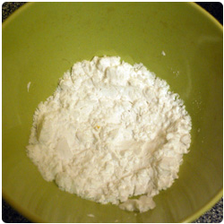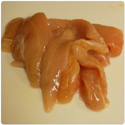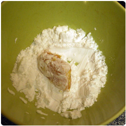 In the meanwhile, put the potato starch in a bowl and, piece by piece, dredge the chicken so the flour coats the meat. |