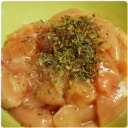Cut the chicken breast into small pieces, put them in a bowl and add the spices. |