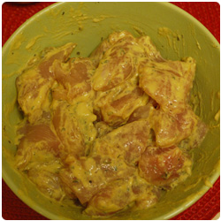 Add 2 spoons of french mustard an mix everything. Let it marinate for 20 min. |