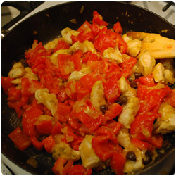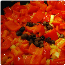 Mix and add the black olives. Let the vegetables cook for 5 to 10 min, depending on how you like the bell peppers (crunchy or soft). |