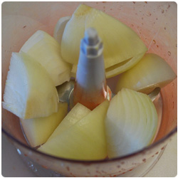 Cut the onion, chop it in the mixer and add it in the pan. Start to cook the veggies at medium heat with 2 tablespoon of olive oil. |