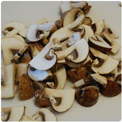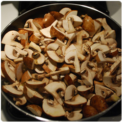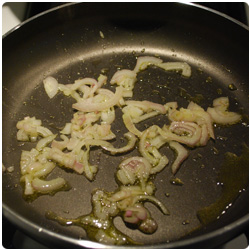 Half an hour before the meat is ready, wash the mushrooms and dice them. In a pan, brown the shallot. |