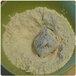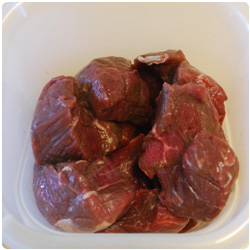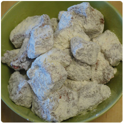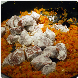 Cut the meat in 3x3cm cubes and dredge them with flour. |