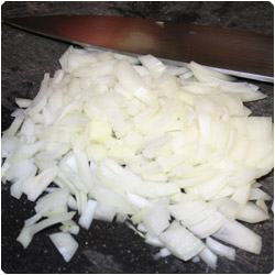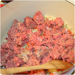 Add salt to taste. Allow the onions to become translucent and add the meat. Stir the meat and vegetable mixture, allowing the meat to brown. |