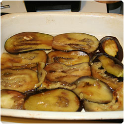Place a layer of eggplant on the bottom of a large baking dish. Next, spoon sauce thinly onto the eggplant to make the next layer. After that, add a layer of pasta noodles. |