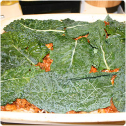 Tthen another layer of sauce on top, then broccoli or peppers, then another layer of eggplant. Continue to alternate the eggplant, broccoli, peppers, and noodles, completing the process with a layer of sauce. You can put a kale garnish on top, if desire. |