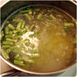 Place a large pot of water and add salt over the heat. Add the potato cubes and the green beans in the cold water. |
