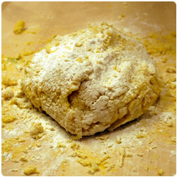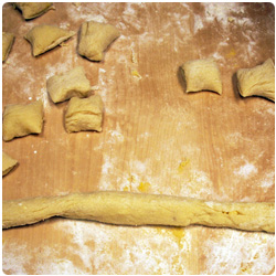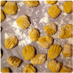 Boil 300g of white potatoes and 300 of pumpkin peel them after the cooking. On your table put 100g of flour, mash the hot potatoes and the pumpkin over it. |