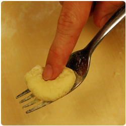 Mix until it forms a solid ball. Divide the ball in smaller pieces and roll them into long logs. Cut the log into 3x3cm pieces. Roll them over a fork, lightly pressing in the center with your finger to create a notch. |