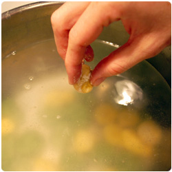 To cook the gnocchi: In a pot boil water and salt it. Add the gnocchi. They will fall in the bottom of the pot, to prevent them from sticking, gently move the surface of the water with a wooden spoon, without actually touching them. |