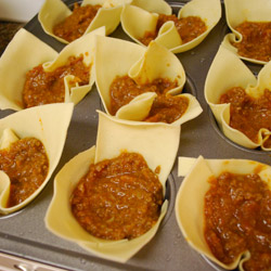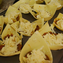 Place the sheets in the cupcake holes. Add some ragù to fill the bottom of the cupcake. Add 1-2 tblspoons of bechamel sauce on top. |