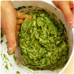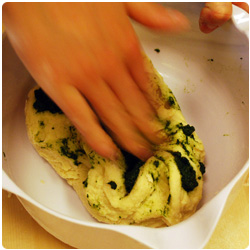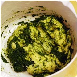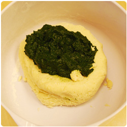 With your hands mix everything, adding extra flour if the dough sticks on your hands. Put the dough in a bowl and add the spinach cream. |