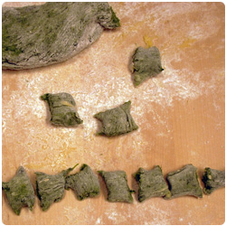 Boil 500g of white potatoes and peel them after the cooking. On your table put 100g of flour, mash the hot potatoes over it, add 2 yolk eggs and a teaspoon of salt. |