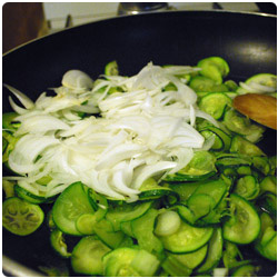 Cut the zucchini in round slices and put them in a pan with 2 tablespoon of olive oil. Start to cook them at low heat. Chop the green onions. |