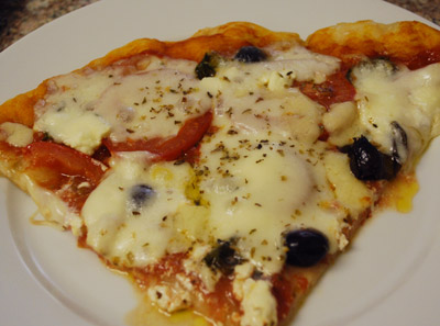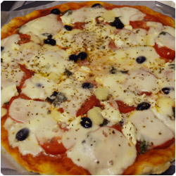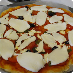 Add the olives and the goat cheese . Cook in the oven at 200°C (390F) for 15 min. In the meanwhile slice the mozzarella. Cover the pizza with it. |
