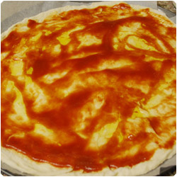 Once the dough is about the same size of the tray pour the olive oil and the tomato sauce on the dough, paying attention to spread them on the crust. |