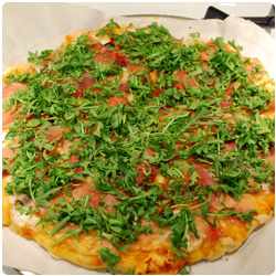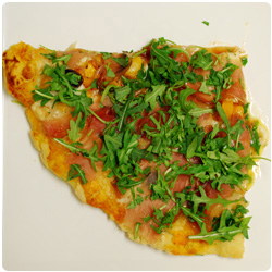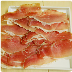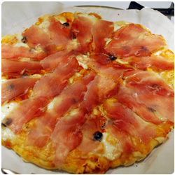 When the crust is well tanned take out the pizza from the oven and until it is really hot add the speck. In this way the speck will melt on the pizza. |