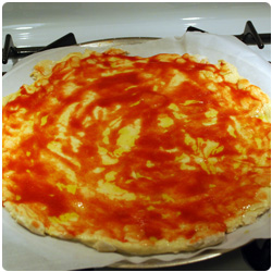 Once the dough is about the same size of the tray pour the olive oil and the tomato sauce on the dough, paying attention to spread them on the crust. |