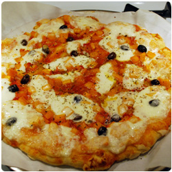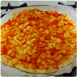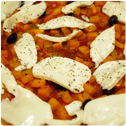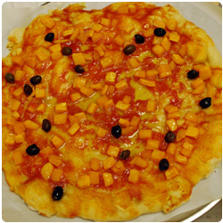 Spread the tomatoes sauce and the oil on top of the dough. Add the pumpkin pieces and cook in the oven 200°C (390F) for 15 min. |
